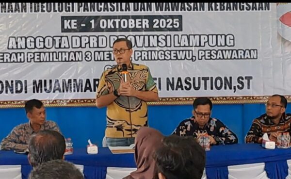 Kota Metro – Anggota DPRD Provinsi Lampung, Tondi Muammar Ghadafi Nasution, menegaskan pentingnya kegiatan Sosialisasi Pembinaan Ideologi Pancasila dan Wawasan Kebangsaan sebagai wadah menjaga serta memperkuat nilai-nilai dasar kehidupan berbangsa dan bernegara.